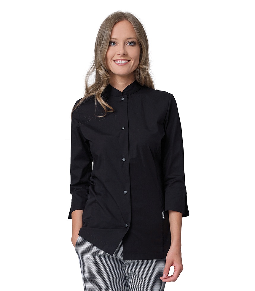 Ženska kuharska bluza jednostavnog dizajna omogućuje lako kretanje i udobnost tijekom cijele smjene. Kraći rukavi pružaju dodatnu slobodu u radu, dok zatvaranje bluze na skrivene drukere osigurava uredan i čist izgled. Blago strukiran kroj prati liniju tijela bez stezanja, a prozračan materijal ugodan je za nošenje u užurbanom kuhinjskom okruženju.